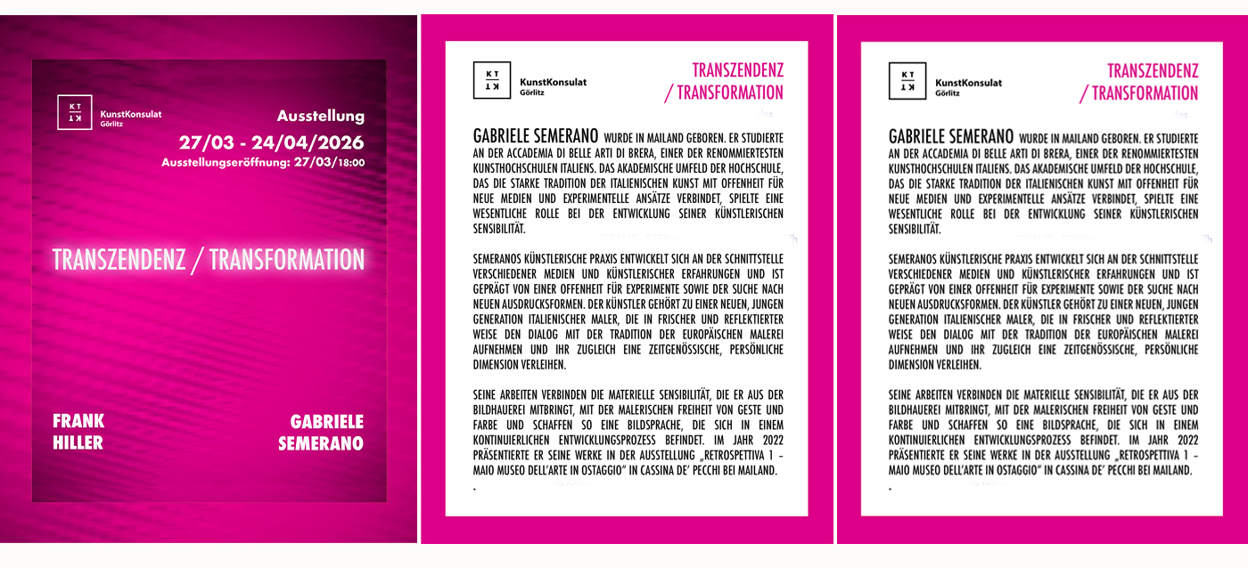 Die Ausstellung präsentiert die Begegnung zweier künstlerischer Positionen, die sich mit dem gemeinsamen Thema des Überschreitens und der Verwandlung auseinandersetzen, dies jedoch durch unterschiedliche visuelle Sprachen tun. Die Künstler vertreten zwei verschiedene Weisen, die Beziehung zwischen Materie, Bild und Erfahrung zu verstehen – die eine in der Expressivität verwurzelt, die andere in der Kontemplation. In diesem Dialog zweier künstlerischer Haltungen wird die philosophische Dimension der Ausstellung sichtbar. Transzendenz bedeutet hier keine Flucht aus der Wirklichkeit, sondern den Versuch, ihre sichtbare Form zu überschreiten und zu tieferen Schichten der Erfahrung vorzudringen. Transformation hingegen verweist sowohl auf den schöpferischen Prozess als auch auf den Akt der Wahrnehmung selbst – auf eine Veränderung, die sich im Verhältnis zwischen Werk und Betrachter vollzieht. In diesem Sinne wird Kunst zu einem Raum des Übergangs: zwischen Bewegung und Stille, zwischen Materie und Idee, zwischen Expression und Kontemplation. Gerade in dieser Spannung zwischen zwei unterschiedlichen Weisen, die Welt zu sehen, entsteht der gemeinsame Raum der Ausstellung – ein Ort, an dem die Form ihre Grenzen überschreiten und sich für neue Bedeutungen öffnen kann.